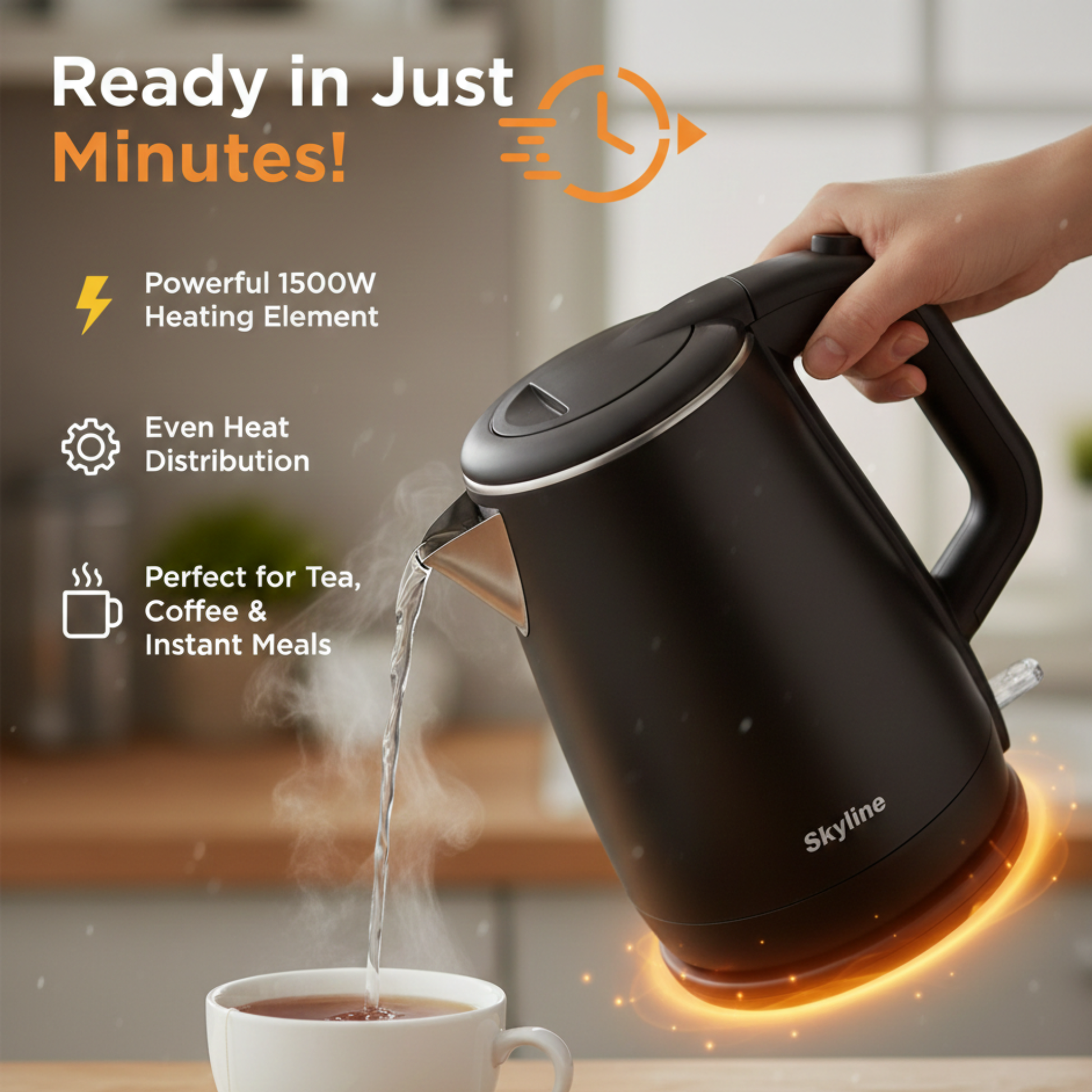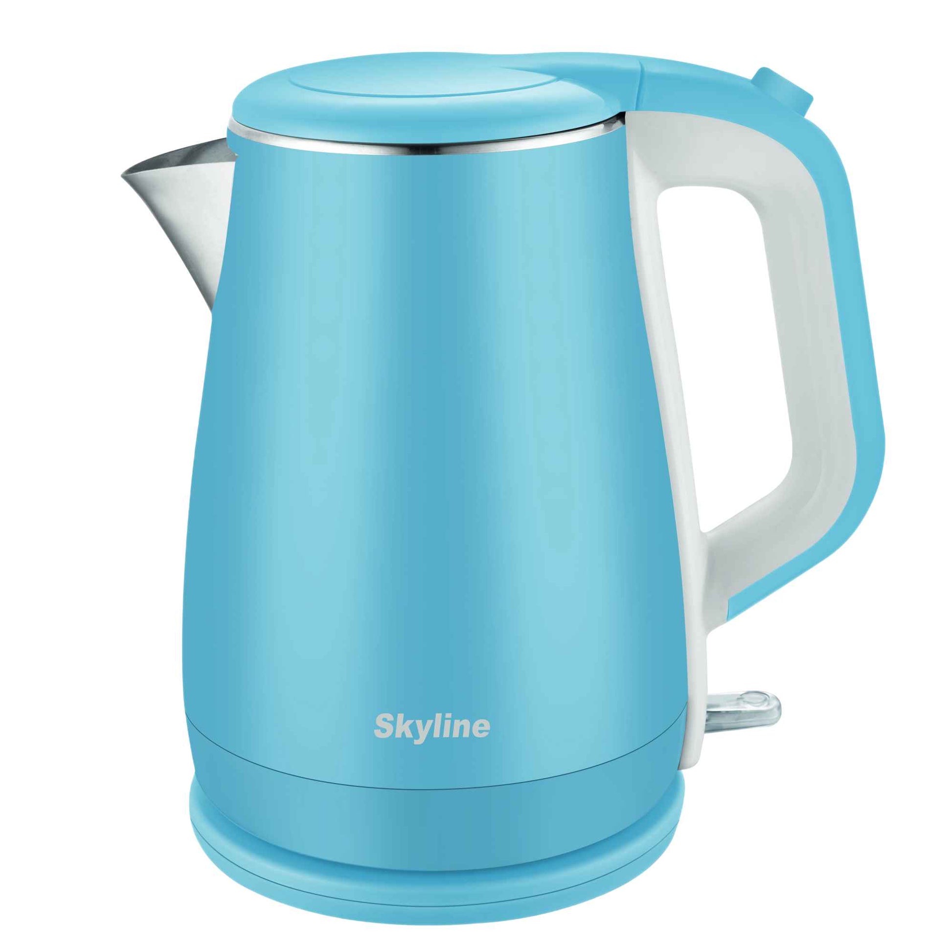 Description: The Skyline Double Wall Electric Kettle is designed for modern kitchens, combining safety, style, and efficiency. With its 1.5-liter capacity and powerful 1500W heating, it boils water quickly while its double-wall insulation keeps the outer body cool to touch, ensuring safe handling. Available in sleek black and vibrant blue, this kettle adds elegance to your countertop while delivering everyday convenience for tea, coffee, instant noodles, and more.